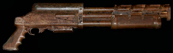 A prop firearm featured in the Star Trek: Enterprise episode “Canamar” for use by alien prison guards on a transport ship. The item is a sturdy bronze colored molded rubber shotgun distressed to appear aged with a broken trigger guard. The item features etchings indicating it to be a replica … |