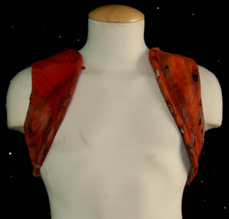 A costume featured in Star Trek II: The Wrath of Khan for wear by one of “Khan's” (Ricardo Montalban) genetically engineered henchmen. The costume is a pair of tan trousers and a trio of orange vests all distressed to appear worn, dirty, and made from furniture upholstery. The items feature … |