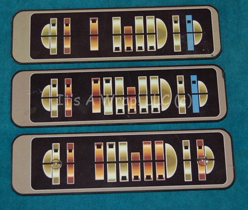 A set of three button panels believed to have been featured in the set for the Denobulan ship “Barzai” in the Star Trek: Enterprise episode “Cold Station 12”. The items are fashioned cardboard with multi-colored graphical applications adhered to the face and remain s of double sides adhesive (or its … |
