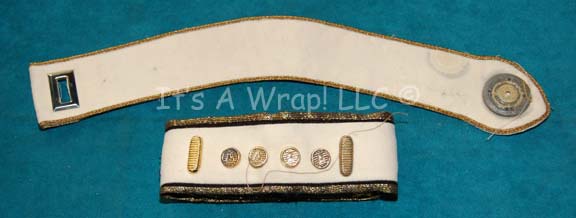 A wardrobe lot created for use on Starfleet officer's uniforms in various Star Trek feature films. The items are gold trimmed command division strips; one is made to be affixed to the right shoulder back and clasped to the front of the uniform, the other for the left forearm sleeve. … |