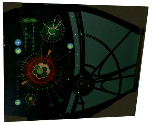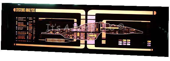 A massive LCARS style (Library Computer Access and Retrieval System) display board created for episodes of Star Trek: Voyager. The item is a piece of smoked acrylic with a multi-colored graphical application adhered to the reverse which is best viewed when back lit by an external light source. The display … |