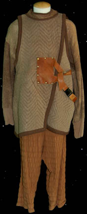 An elaborate Pakled costume featured in the Star Trek: The Next Generation episode “Samaritan Snare”. The costume is a series of thickly padded tan and brown elements consisting of texture patterned trousers, a thick woven sweater, a quilted jacket with brown trim and affixed brown leather straps and buckles, a … |