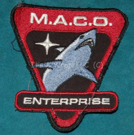 An inverted triangle patch featured in various episodes of Star Trek: Enterprise for wear by MACO's (Military Assault Command Operations). The item is a black bordered patch with a red backing, a black inner triangle with a graphic of a great white shark and a white star over a bar … |