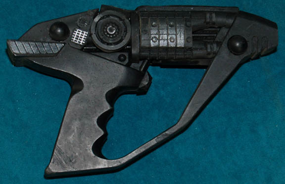 A prop energy pistol featured in various episodes of Star Trek: Voyager like “Concerning Flight” and “Retrospect”. This style of weapon has also appeared as a Jem'Hadar hand gun in multiple episodes of Star Trek: Deep Space Nine. The item is sturdy black molded rubber with molded details and a … |