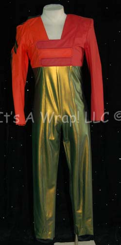 A pair of like costumes featured in Star Trek: Deep Space Nine for wear by a male and a female alien explorer. The costumes are trousers with copper mesh over patterned brown vinyl strips and an iridescent orange shirt with a multi-colored jacket featuring brown faux fur shoulders. The costumes … |