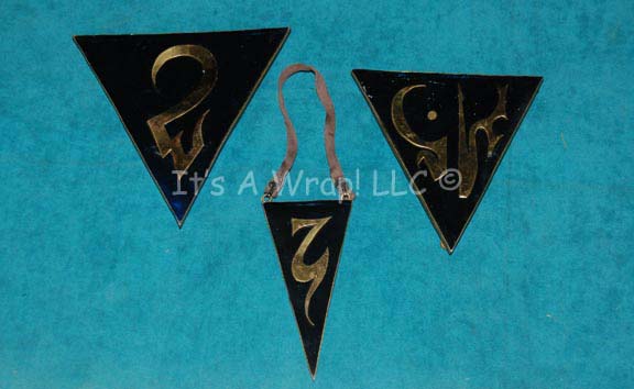 A selection of matching jewelry believed to have been created for Star Trek III: The Search for Spock. The items are triangular oversized metal backed badges with translucent blue faces that feature adhered metal Vulcan iconographic letters. The items feature pin backings to affix to costumes and the smallest one … |