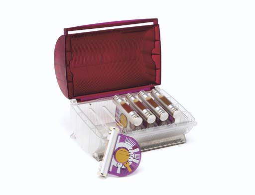 Five prop Vulcan data cartridges made from brushed aluminum and acrylic plastic with silkscreened "circuit" details, with a red and clear plastic carrying case made from a modified compact disk holder -- featured in "Stigma" in <I>Star Trek: Enterprise</I> as an archive of forbidden Vulcan medical information (6) |