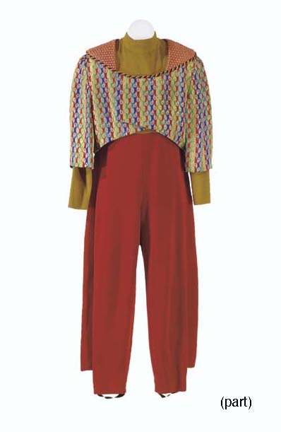 Four costumes, comprising: a Bajoran-style civilian costume with green lycra jumpsuit, mustard wool pants and gold wool shirt; a Bajoran-style civilian costume with orange and gold wool jumpsuit and Ferengi-styled rainbow-colored striped shirt from "Live Support"; a Ferengi-styled orange shirt with muticolored striped panel and green pants; and a black … |