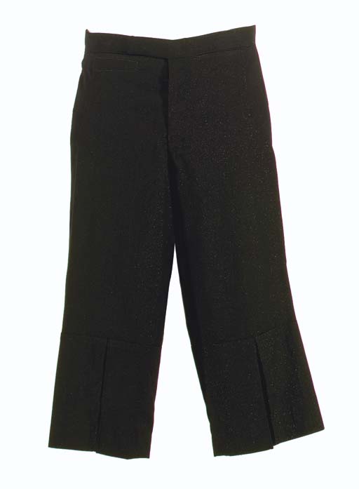 A pair of <I>Original Series</I>-style pants, calf-length, made from black gabardine with woven metallic glint and flared pleated cuff, inscribed inside <I>Walter Koenig</I> -- worn by Walter Koenig as Chekov in <I>Star Trek: The Original Series</I>; with corresponding wardrobe tag |