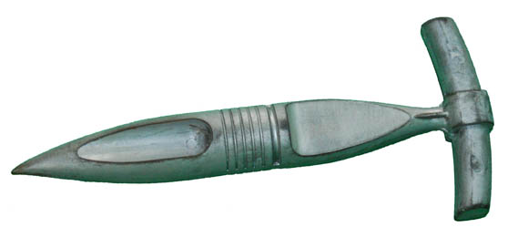 A solid cast rubber hammer painted metallic silver. This prop of ‘alien' design was used in the Star Trek: Voyager episode “Revulsion” as The Doctor (Robert Picardo) and B’Elanna Torres (Roxann Dawson) responded to a distress call from a holographic character named Dejaren (Leland Orser). It was with this hammer … |