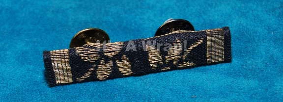 A Starfleet officer’s campaign ribbon created for Star Trek VI: The Undiscovered Country and of the style appearing in Star Trek VII: Generations. The item is fabric covered sheet plastic with twin pin backs. The item is colored black with gold floral print embellishments and gold stripes down both sides. … |