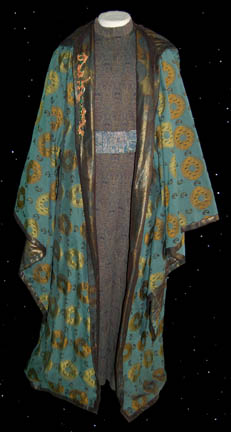An impressive costume featured in various episodes of Star Trek: Enterprise, this lot is composed of a patterned green under robe, a waist sash of crushed shiny green and yellow synthetic fabric that clasps via a wide Velcro patch, and an outer robe, green with yellow Mandarin themed circles and … |