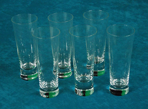 A set of six table glasses appearing in Star Trek episodic television with a weighted base these items measure at just over 7 inches high with a 2.75 inch diameter lip. |