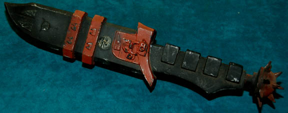 A Klingon knife made for use in Star Trek episodic television. Made of foam rubber the knife is painted black and brown and has faux spikes at the top of the hilt. On the reverse side are metal clips for attaching the knife to a costume. Measures approx. 14 x … |