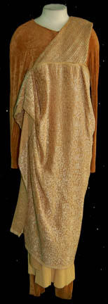A gold colored costume jumpsuit with a crimped over drape featured in the Star Trek: Voyager episode “Emanations”. The over drape features a patterned velvet-like fabric. The costumer's tag reads ‘David Clover #109’ and is stamped ‘Voyager’. |