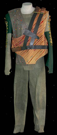 A costume featured in the Star Trek: The Next Generation episode “Darmok” wherein “Captain Picard” (Patrick Stewart) and an alien captain are both stranded on a planet and must learn to cooperate despite a substantial language barrier. The costume has a green animal skin design, an intricate, gold-thread embroidered pattern … |