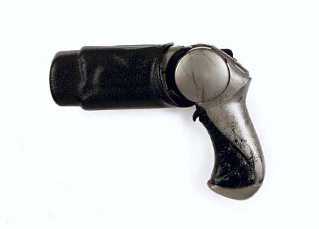 Four prop pistol weapons, one made from solid cast resin, one made from hard rubber, and two cast from soft foam, all painted black and pewter with two holster clips made from vacuum-formed black sheet plastic -- <I>7½in. long</I> -- featured as Tellarite weapons in "Bounty" in <I>Star Trek: Enterprise</I> … |