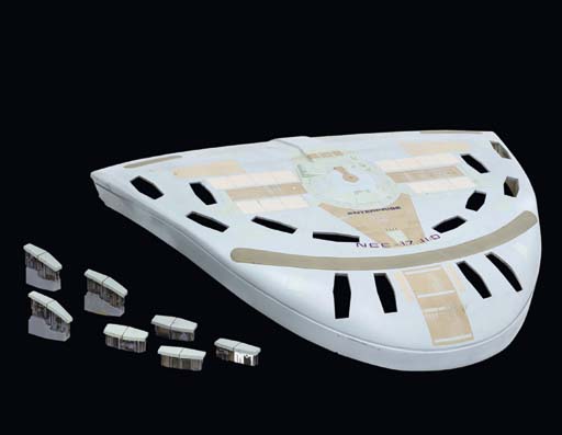 A spade-shaped visual effects model of the upper surface of the "battle head" section of the <I>Starship Enterprise-D</I>, revealed when the saucer-shaped primary hull separated from the stardrive section, resin, glass fiber, and aluminum construction, one loose "docking latch" model piece -- <I>21x25in.</I> |