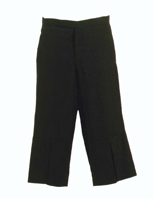 A pair of men's <I>Original Series</I>-style black uniform pants with woven metallic glint and short, non-pleated, flare cuffs -- believed to have been used in the third season of <I>Star Trek: The Original Series</I> |