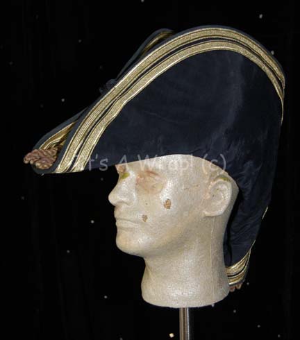 A stunt costume hat created for “Worf” in Star Trek VII: Generations. The item is a Victorian era styled British Royal Navy officer’s hat used during the promotion ceremony that took place in the holodeck. The hat is navy blue with gold trim and braided tassels. The item is fitted … |