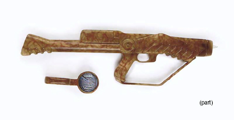 | (Paramount TV, 1993-99) This early version of the Bjoran phaser pistol is constructed of copper, bronze and black-painted molded resin. It was used during the first to third seasons, while later models sport the gold, bronze and black color scheme. Measures approx. 9 ½ inches long. |