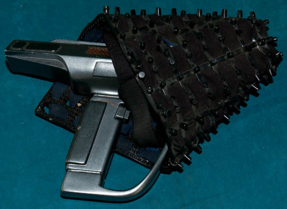 A prop molded rubber alien energy weapon featured variously in Star Trek episodic television. The weapon is blocky in its shaping with a long cylindrical stock and a rectangular receiver. The emitter muzzle features an affixed bayonete painted metallic silver, made from rubber with a metal inner frame. The whole … |