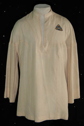 A costume featured in Star Trek I: The Motion Picture for wear by characters on board the ‘Epsilon IX Station'. The costume is a cream colored shirt with an open neck and an affixed yellow backed ‘Epsilon IX’ assignment patch on the left breast. |