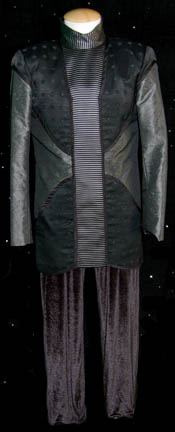 A costume featured in the Star Trek: Enterprise episode “Demons”; wherein a xenophobic faction known as “Alpha Prime” seeks to derail the very first formal discussions of what would become the United Federation of Planets. This costume is a sleeveless, black velveteen jumpsuit with stirrups for the feet; a long-sleeved, … |