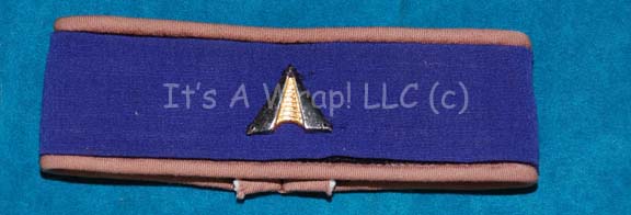 A costume accessory created for Starfleet security commandos on the “U.S.S. Enterprise-A” in Star Trek V: The Final Frontier. The item is a tan bordered black felt strip with a rich purple fabric affixed around it and a gold and silver colored metal badge indicating the wearer to be an … |