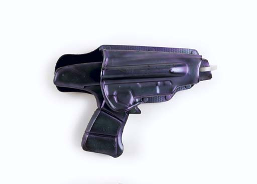 Two prop pistol weapons made from rubber, painted iridescent blue-purple, with similarly-painted hard plastic holster clips -- used by the Xindi Reptilians in the third season of <I>Star Trek: Enterprise</I> (4) |