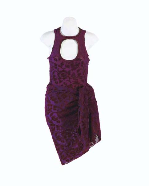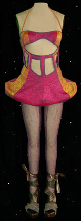 A costume featured in the Star Trek: Enterprise episode "Rajiin" on one of the “Zjod's” bazaar girls. It is a dress with pink and orange over neoprene, purple hose with a reptilian mesh, a pink g-string, and bronze colored high heels. Sewn in tag reads "Roxanne Doman" and the costumer's … |