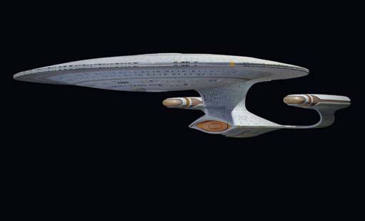 The hero visual effects miniature of the <I>Starship Enterprise-D</I> from <I>Star Trek: The Next Generation</I></B>, fiber-reinforced cast resin construction with internal neon lighting [untested] on an aluminum armature with motion control mounts, with motion-control mounting hardware, power supply box [untested] marked "obsolete" and box marked "neon lights" -- <I>78x59½x14½in.</I> -- … |