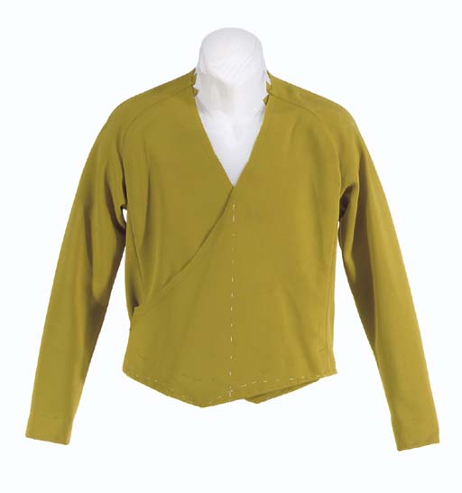 A long-sleeved men's informal uniform shirt of mustard/gold polyester doubleknit featuring wraparound design with saddle-yoke ragland sleeves, the sleeves hemmed, but neckline and hem unfinished, different colors of basting threads suggest this was a work-in-progress, possibly indicating that Theiss was in the process of redefining this garment's shape -- designed … |