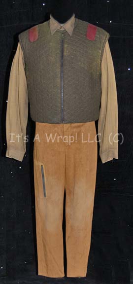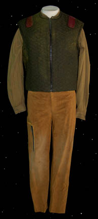 A costume featured in Star Trek VIII: First Contact for wear by Brent Spiner in his portrayal of “Data”. The costume is a set of suede mustard colored trousers with black nylon suspenders and a matching belt, a mustard colored long sleeved button front shirt with a fine black zigzag … |
