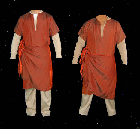 This his and hers pair of costumes was worn by two aliens during the Star Trek: Enterprise episode “Two Days and Two Nights”. Each costume comprises of beige pants, brown and orange tunic tops with draped additional fabric accents at the sides and long sleeve beige shirts. The male shirt … |