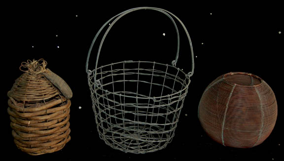 This diverse set of three containers was used as set dressing during the filming of Star Trek episodic television. One is woven wood strips around a wire frame with a piece of rubber covering the opening in the top. The second container is a sphere made of wire with sea … |