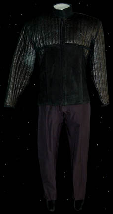 A two piece ‘Khazon' costume from the episode “Alliances” worn by Tom Morga while portraying the ‘First-Maje of the ‘Khazon-Pommar’ “Minnis”. Made up of dark gray pants with black elastic stirrups and suspenders, and a quilted uniform jacket that zips up the left side under the arm and features multiple … |