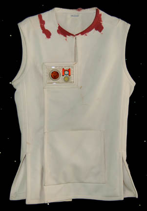 A costume featured in Star Trek II: The Wrath of Khan for wear by “March” (Kevin Rodney Sullivan) following “Khan's” (Ricardo Montalban) attack on the ‘Regula I’ space laboratory. The costume is a cream colored vest with dried special effects ‘blood stains’ around the neck, an asymmetrical front that seals … |