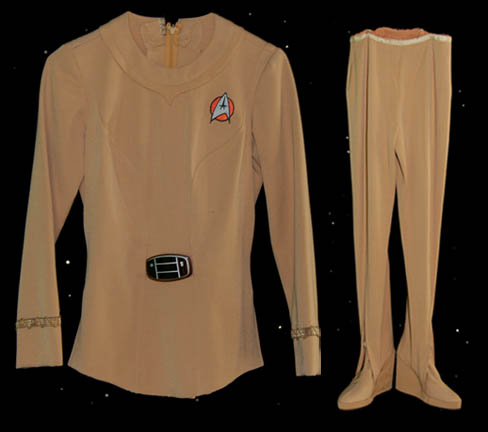 A tan colored Class-A Starfleet uniform featured in Star Trek I: The Motion Picture. The costume is tan trousers with attached shoes and matching uniform top that features an attached bio-monitor and an engineering red backed Starfleet emblem patch on the left breast. The costumer's tag reads ‘Branner, Sc. 99 … |