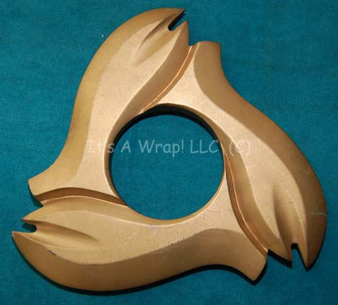 A prop item created for use in Star Trek episodic television which may have been intended for use as a ‘Capellan Kligat’ as appeared in the Star Trek episode “Friday’s Child”. The item is solid cast resin with a molded tri-blade appearance, and a circular cut out in the center. … |