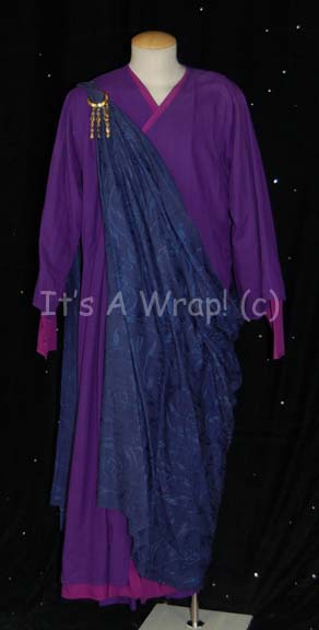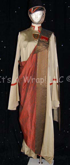 A costume featured of the style featured in various Star Trek feature films. This costume consists of a full-length robe in a gorgeous, metallic-gold color, a triangular ‘jewel’ on the chest inscribed featuring Vulcan iconographic symbols, large, bell-sleeves with rust colored-stripes around the cuffs and matching stripe around the collar … |
