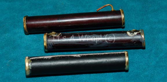 A lot of three uniform accessories like those appearing on Klingon warrior costumes in Star Trek episodic television. The items are molded resin cylinders with wire backings and metal ends. The items are distressed to appear ‘aged’ and measure approx. 3 X 0.5 inches. These items appear on the right … |