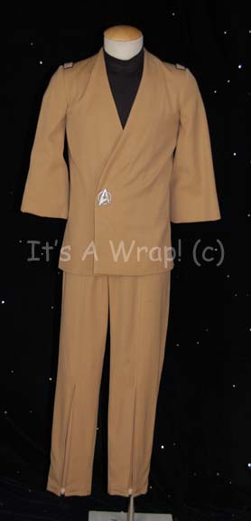 A costume featured in the first Star Trek feature film for wear by Walter Koenig as “Lieutenant Pavel Chekov”. This costume consists of a sleeveless, black undershirt, a tan, long-sleeved, Class-C, uniform jacket featuring a wrap-around front with a pewter-colored, metal Starfleet emblem affixed that is secured by a hidden … |