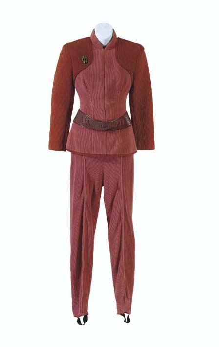 A two-piece Bajoran uniform, the red corduroy long-sleeved jacket, trimmed at the shoulder and arms with red suede embroidered with a diamond pattern, with Bajoran communicator badge, with matching pants and vinyl belt, the jacket and pants with <I>Deep Space Nine</I> label inside inscribed <I>Nana Visitor</I>, with a brown vinyl … |