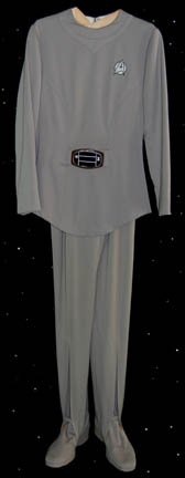 A costume featured in Star Trek I: The Motion Picture for wear by Billy Van Zandt n his portrayal of the ‘Rhaandarite Ensign' on the bridge of the “USS Enterprise”. The costume is a gray colored Class-A Starfleet uniform with matching trousers with attached shoes, an affixed Starfleet logo patch … |