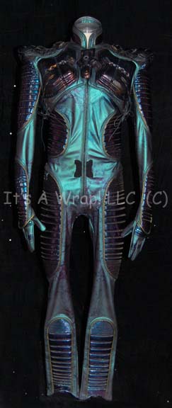 A costume featured in Star Trek X: Nemesis for wear by Reman Warriors on board the starship “Scimitar”. The jumpsuit is purple molded vinyl with an iridescent sheen, gold piping accents, zip cuffs and ankles, a zip front, matching boots and gloves, and chest/shoulder armor with a variety of stitched … |
