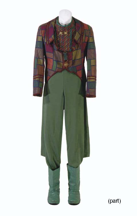 A three-piece costume, comprising: a cropped wool jacket, a cropped cotton shirt of multi-colored cotton (two: one with battle damage) and a sleeveless jumpsuit of green wool (2), with a pair of green boots -- made for Amin Shimerman as Quark in <I>Star Trek: Deep Space Nine</I>; accompanied by a … |
