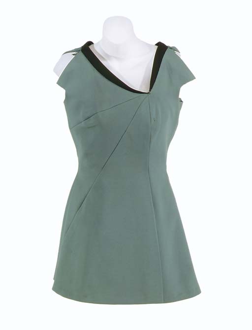 A woman's <I>Original Series</I>-style Starfleet uniform minidress of blue polyester doubleknit, with asymmetrical sunburst body contouring seams, black collar, invisible zipper in back, and built-in bra [sleeves removed] -- designed by William Ware Theiss and believed to have been made for the third season of <I>Star Trek: The Original Series</I>, … |