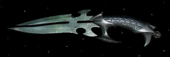 A prop knife made for Star Trek X: Nemesis. This double sided knife features a solid talon style hand guard and a tri-laterally symmetric pommel with a corresponding talon guard, the handle features reptile skin style mold grip. The item measures approx. 15 X 4 inches. |