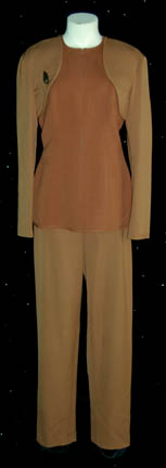 A two piece Bajoran uniform with brown mustard colored pants and a brown uniform jacket with brown mustard colored shoulders and sleeves. The uniform comes with a Velcro affixed metal Bajoran communicator badge, as well as a Bajoran earring. The uniform also features matching brown painted boots detachable shoulder pads. … |